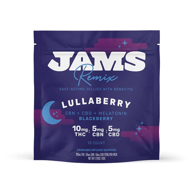 Turn up the flavor and turn down the lights - JAMS Remix Lullaberry Fast-Acting Jellies with Benefits usher you to dreamland. These specially designed jellies help you sink into bed with the stacked benefits from THC, CBN, CBD and Melatonin. For best results, pair Lullaberry with cool, fluffy pillows and a night light. Each fast-acting ratio jelly contains 10mg THC, 5mg THCV, 5mg CBG with 10 jellies per pack.