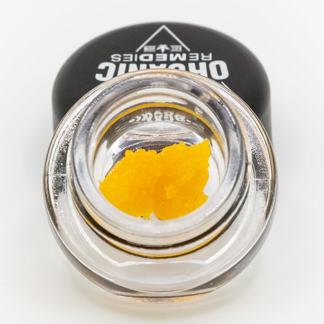 An in-house blend of the "Pie Hoe", "Cherry Slushy", and "Garlic Cherry Gelato" strains was used to create this indica-leaning hybrid concentrate.